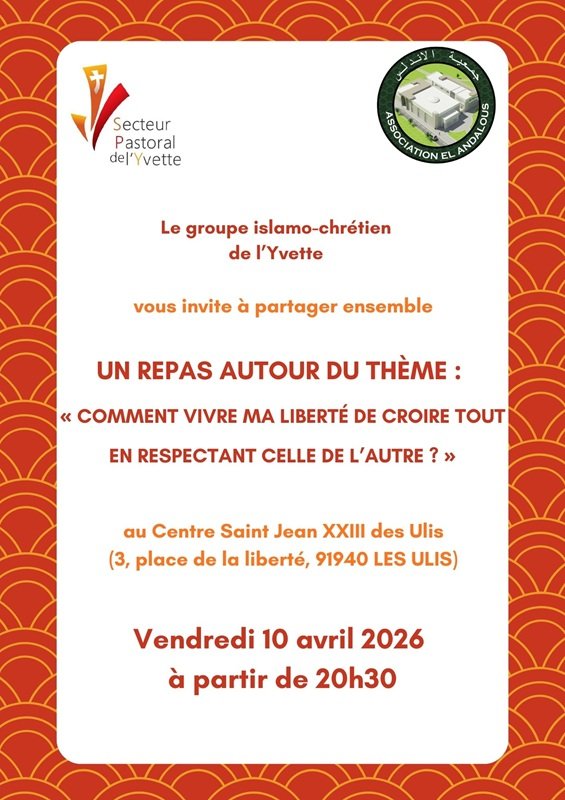 Le groupe islamo-chrétien de l'Yvette a le plaisir de vous inviter à partager ensemble un repas autour du thème : "Comment vivre ma liberté de croire tout en respectant celle de l'autre ?", vendredi 10 avril à partir de 20h30, au centre Saint-Jean XXIII des Ulis.