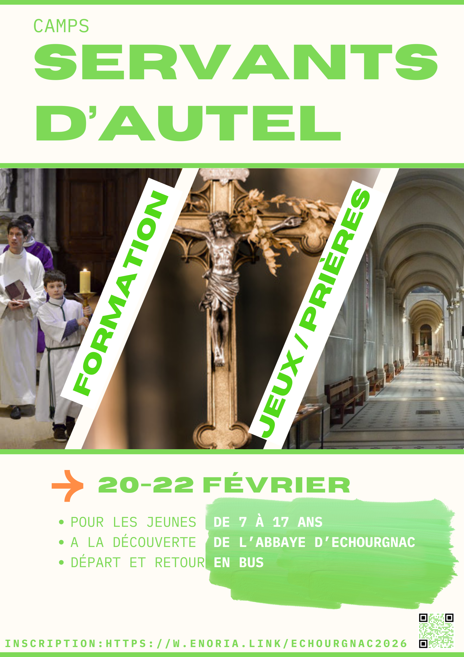 Le service diocésain pour les servants d'autel n'a pas fini sa mission cette année et il leur propose un petit camp du 20 au 22 février à l'abbaye d'Echourgnac. Le nombre de places est malheureusement limité, donc n'hésitez pas à vous ruer dessus. Ils sont pris en charge du départ du bus au retour. Je vous mets en PJ l'affiche avec le QR code dessus et sinon voici le lien d'inscription : https://w.enoria.link/echourgnac2026