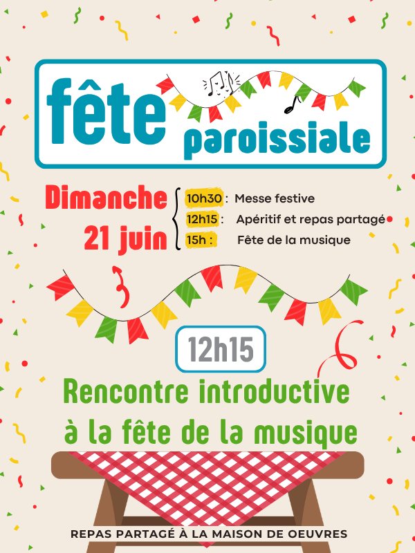 Invitation à vivre un temps de fête paroissiale comme une introduction à la fête de la musique. Tous invités !
