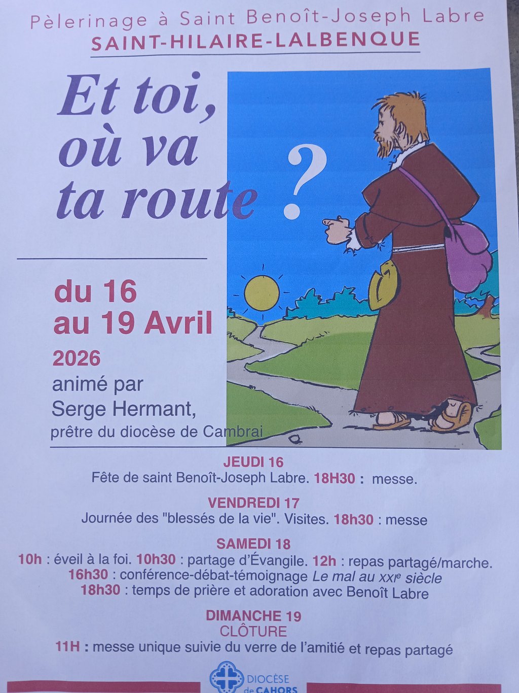 Depuis quelques décennies, l'église Saint Hilaire du groupement paroissial de Lalbenque-Vaylats a l'habitude d'organiser un pèlerinage à Saint Benoît Joseph LABRE, un Saint pèlerin qui est passé par ce territoire. Ce pèlerinage de 4 jours a lieu autour de la date de la fête patronale du Saint (le 16 avril). Cette année cela commence jeudi 16 avril soir par une messe et se clôture dimanche 19 avril par une messe et un verre de l’amitié. (Cf. l'affiche)