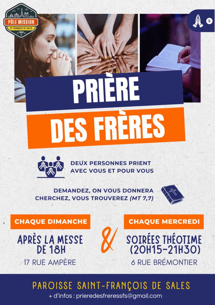La prière des frères est la réponse concrète à cette invitation de Jésus à intercéder les uns pour les autres. Un binôme de priants, formés et accompagnés par un prêtre de la paroisse, vous accueille pour présenter votre intention au Seigneur, prier avec vous et laisser l’Esprit Saint agir. Concrètement, vous pouvez les retrouver le dimanche soir après la messe de 18h, le mercredi soir durant les soirées Théotime et pendant les missions annuelles.