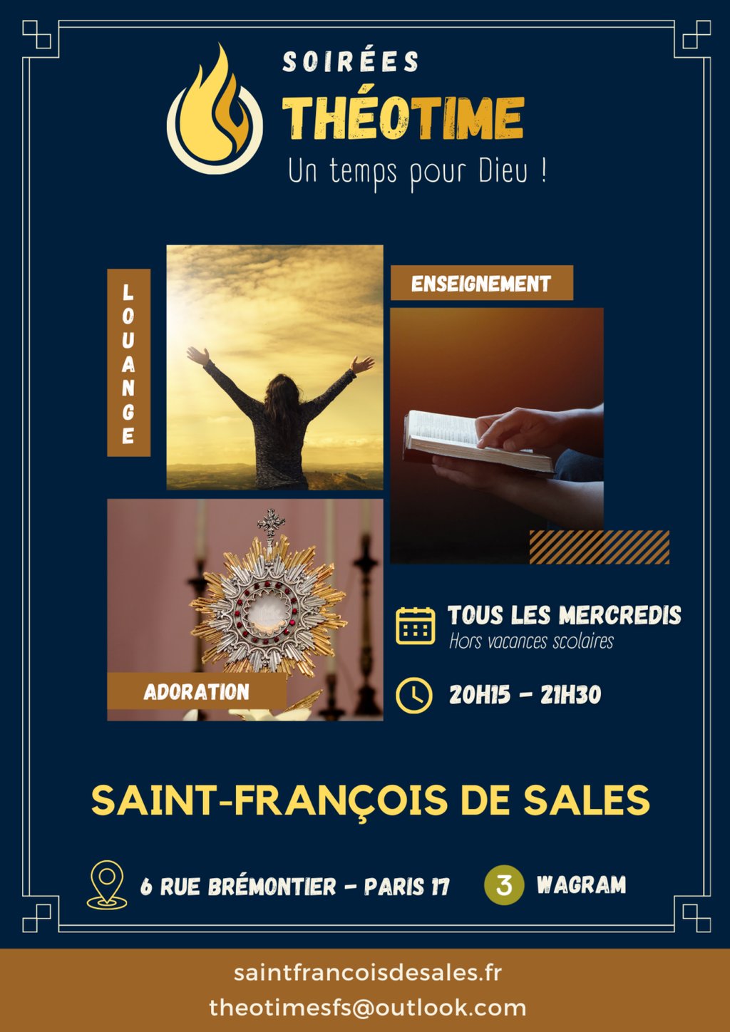 À travers l’Adoration, comme Théotime, le disciple de Saint François de Sales, venez exulter de joie en rendant grâce pour les merveilles que Dieu accomplit au quotidien. Mettez-vous à l’écoute de sa Parole pour qu’elle transforme votre vie. Plongez dans la prière pour demeurer auprès du Cœur de Jésus brûlant d’amour pour vous. Louange, prédication, adoration : les trois ingrédients pour dynamiser votre relation au Christ et devenir un authentique disciple-missionnaire !